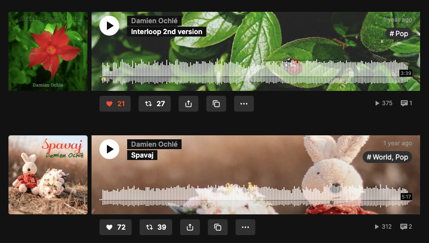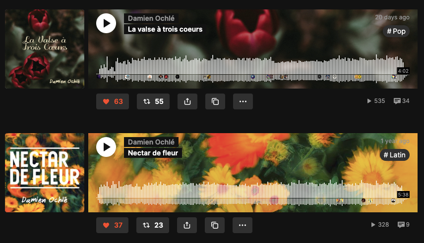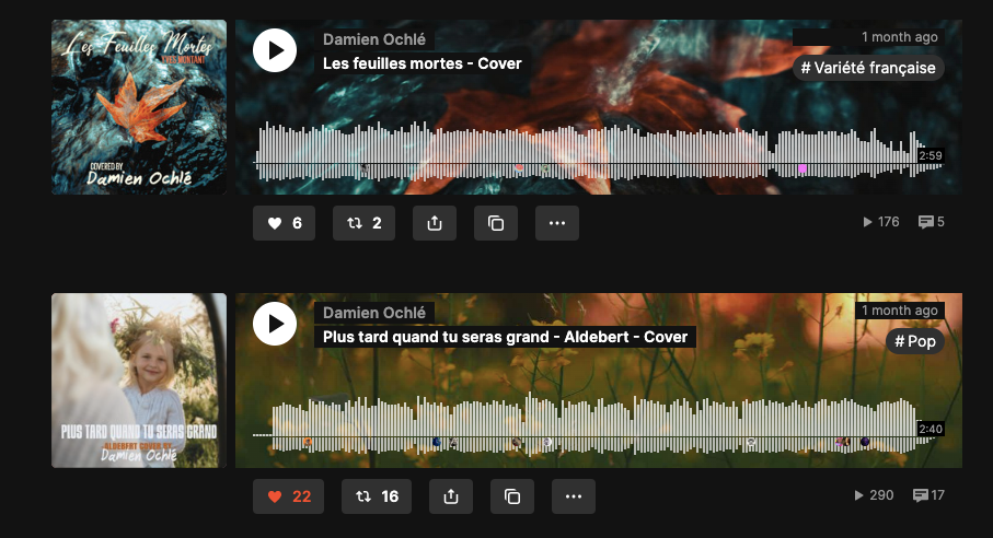 J’ai retravaillé les covers de plusieurs singles de Damien Ochlé pour Spotify, SoundCloud et Instagram. Cela a été fait avec des images libres de droits afin qu'il puisse les utiliser comme il le souhaite et je me suis basée sur une sélection de photos qu'il avait déjà fait pour les pochettes d'avant.